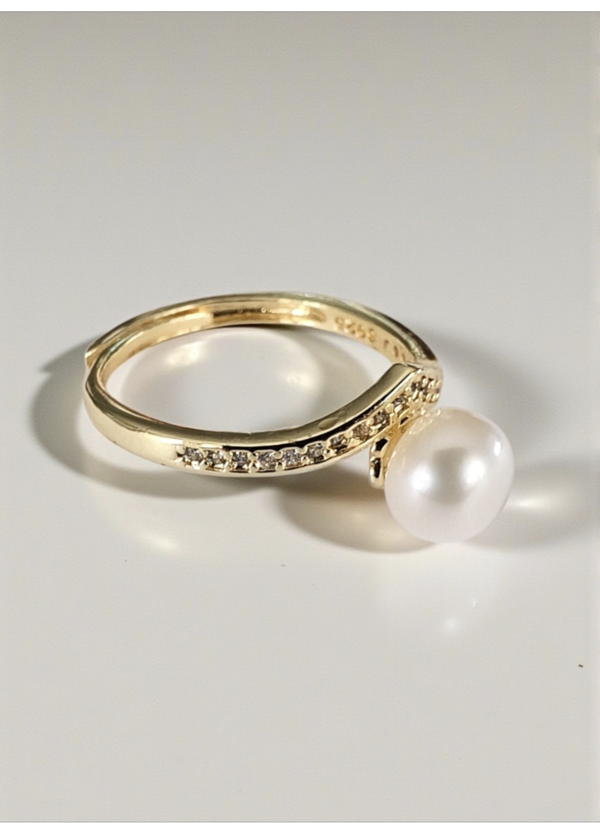 Anillo hecho con perla de agua dulce y metal antialérgico bañado en oro. Es ajustable.