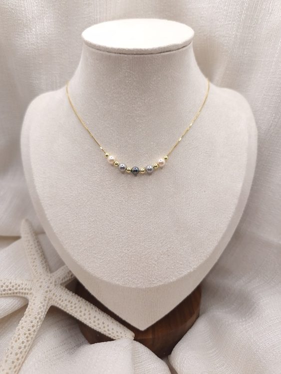 • Cadena de plata bañada en oro con perlas de Mallorca de 4 mm en color negro, gris y rosa