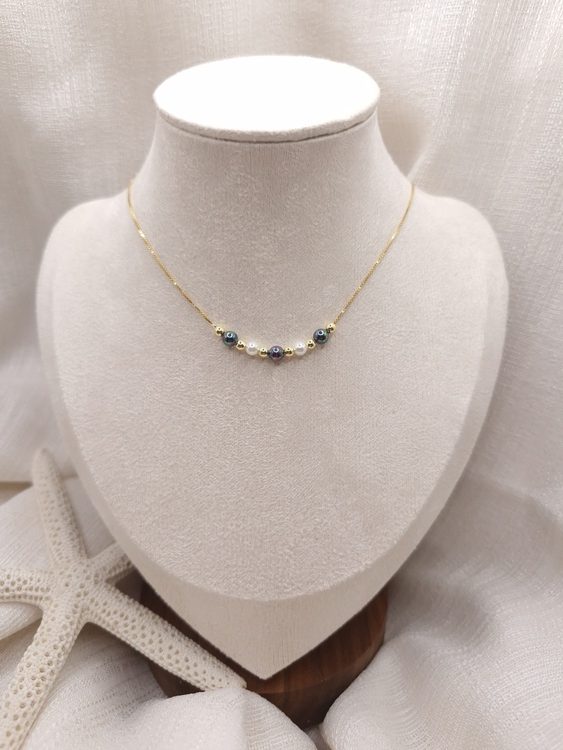 • Cadena de plata bañada en oro con perlas de Mallorca de 4 mm en color blanco y negro
