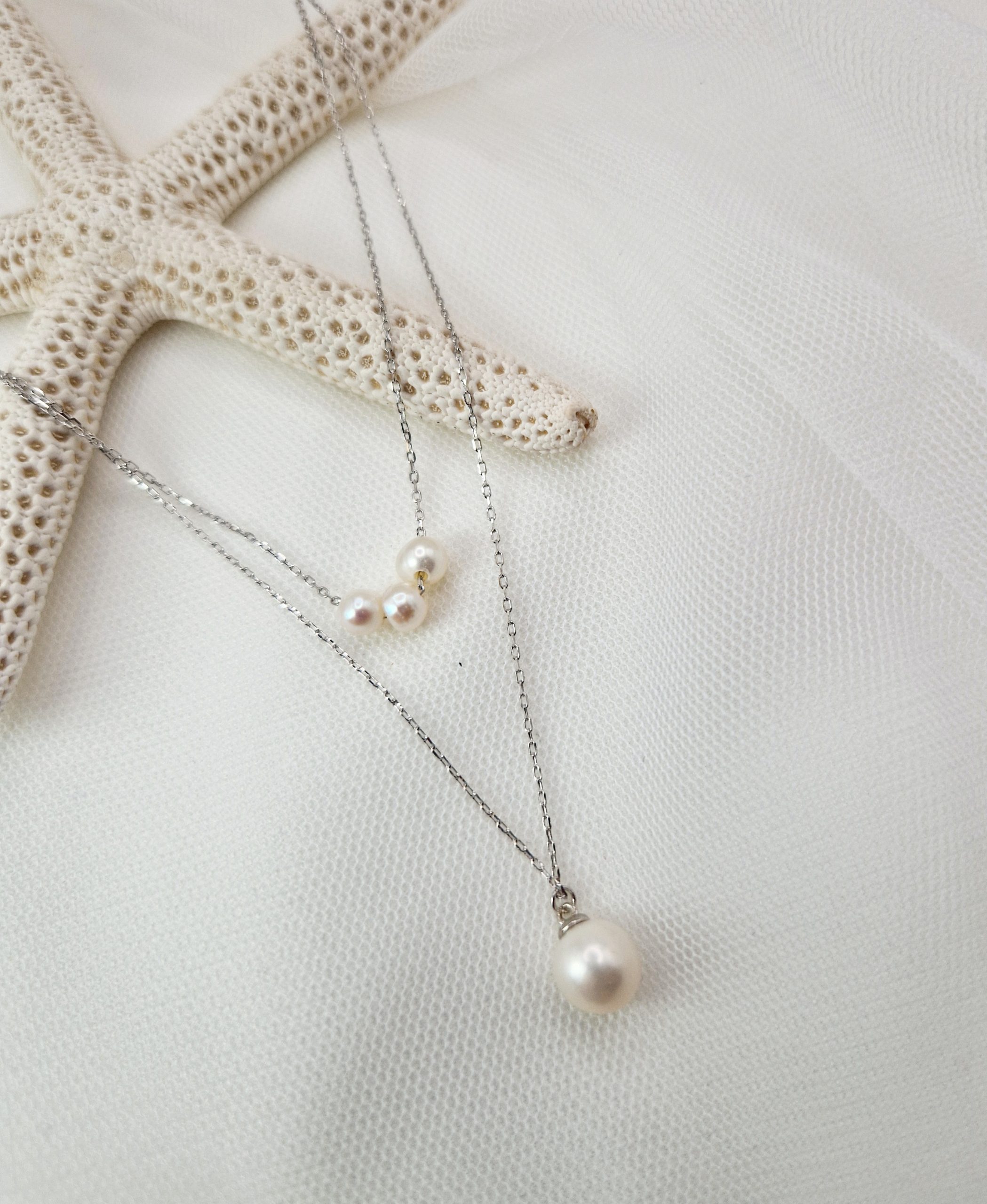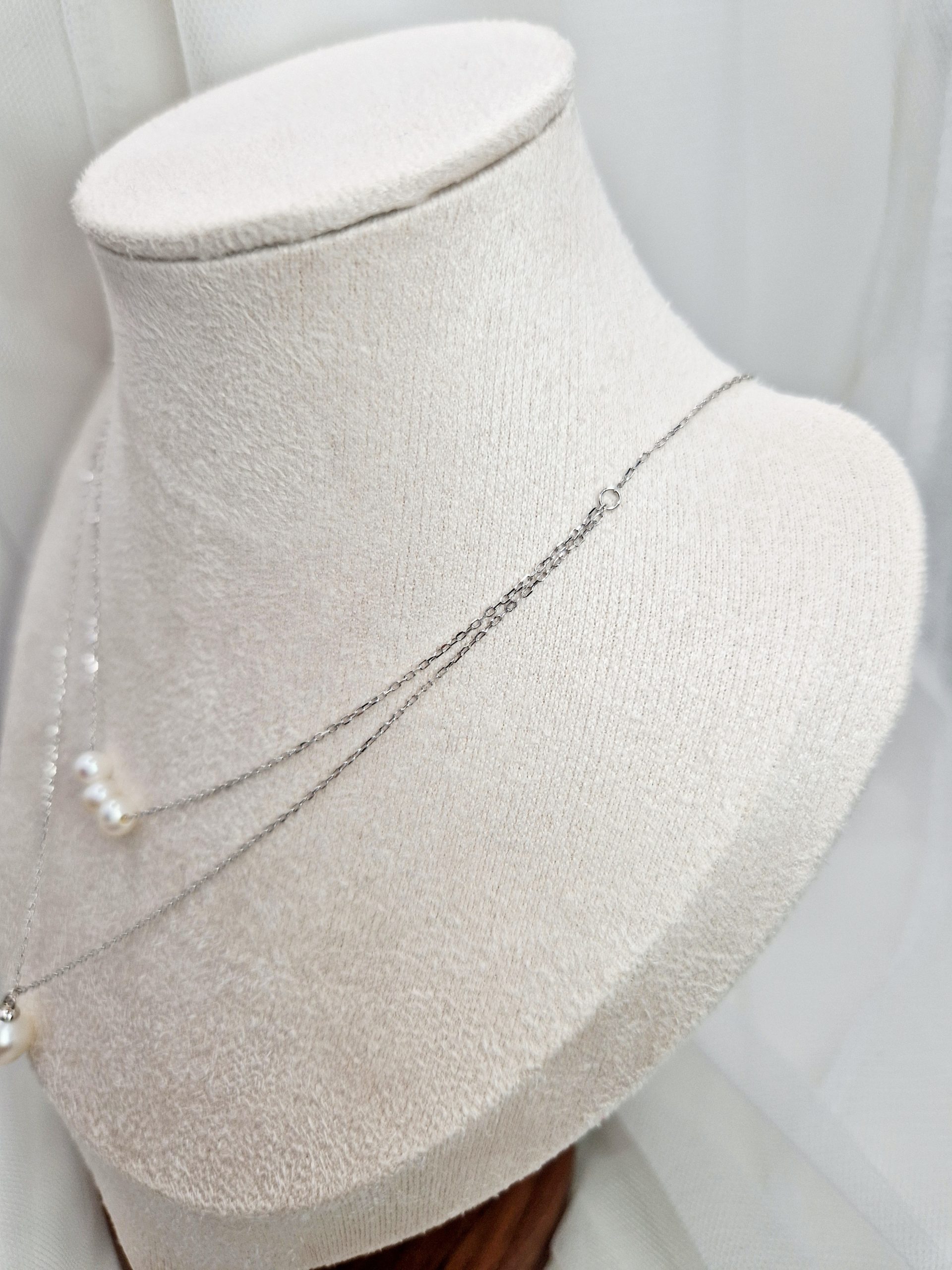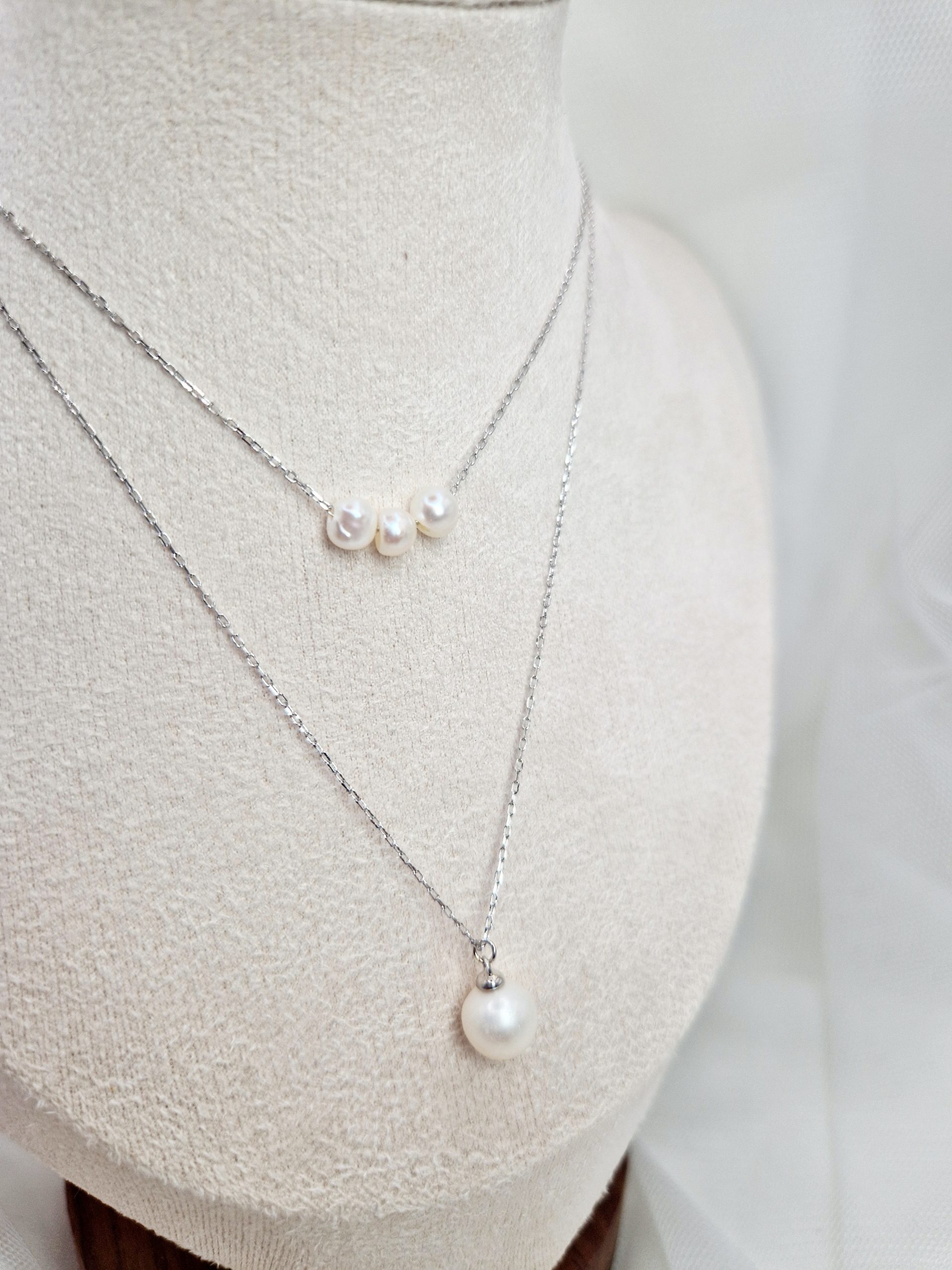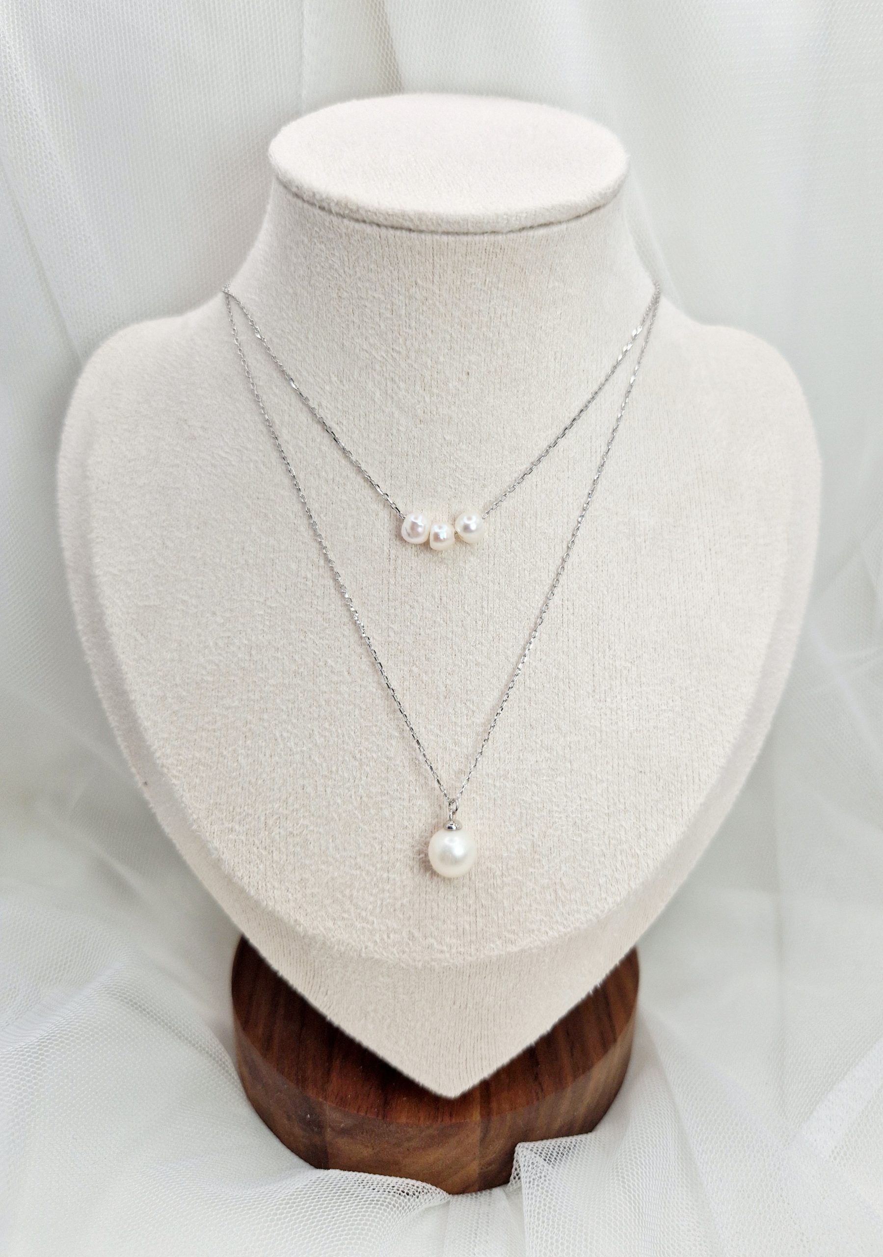 Cadena de dos vías hecha con plata de Ley 925 y perlas de agua dulce de 4 y 8 mm.