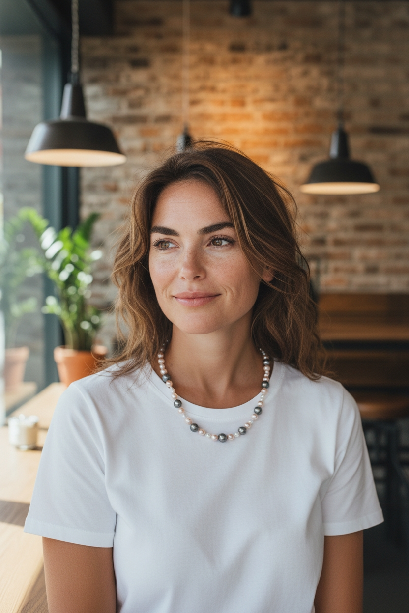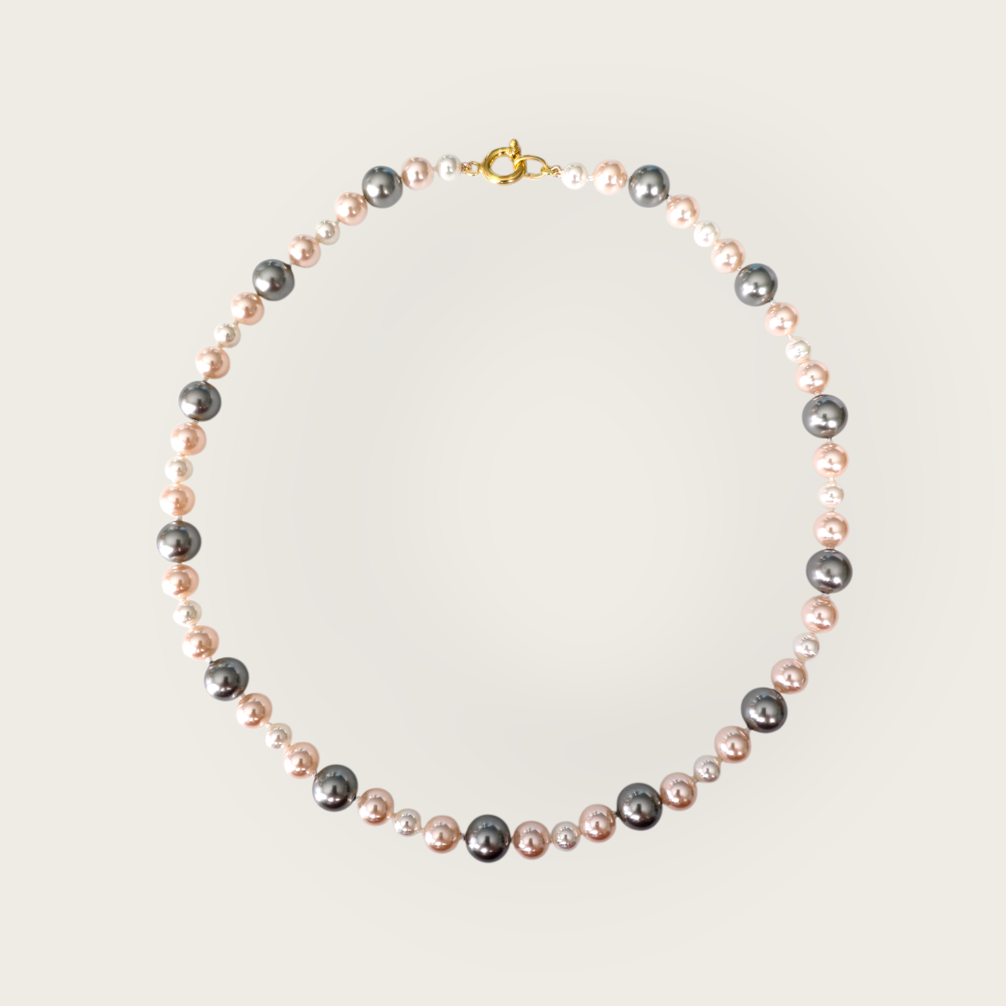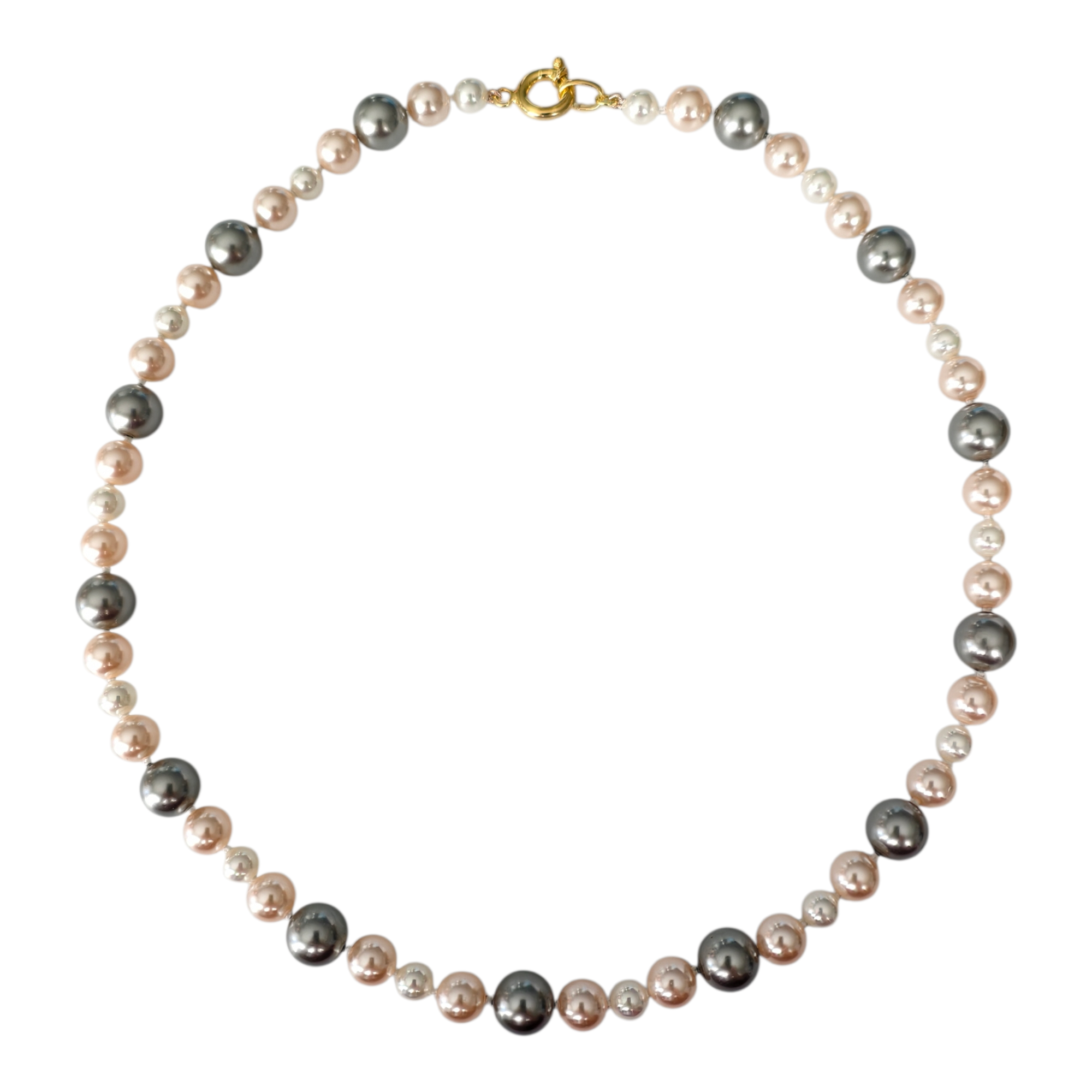 Elegante collar hecho con perlas de Mallorca de primera calidad y cierre de plata de Ley 925 bañado en oro 18 Kt. El collar lleva las perlas mallorquinas: