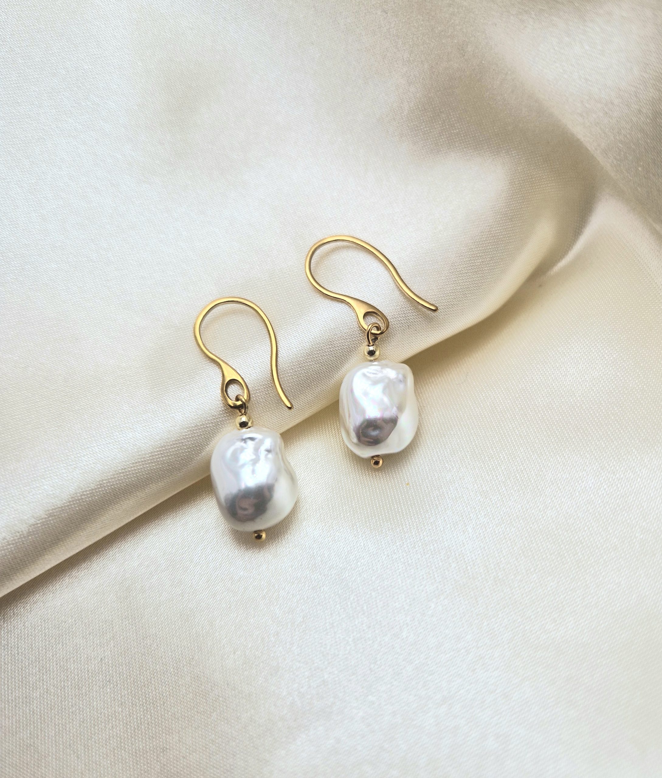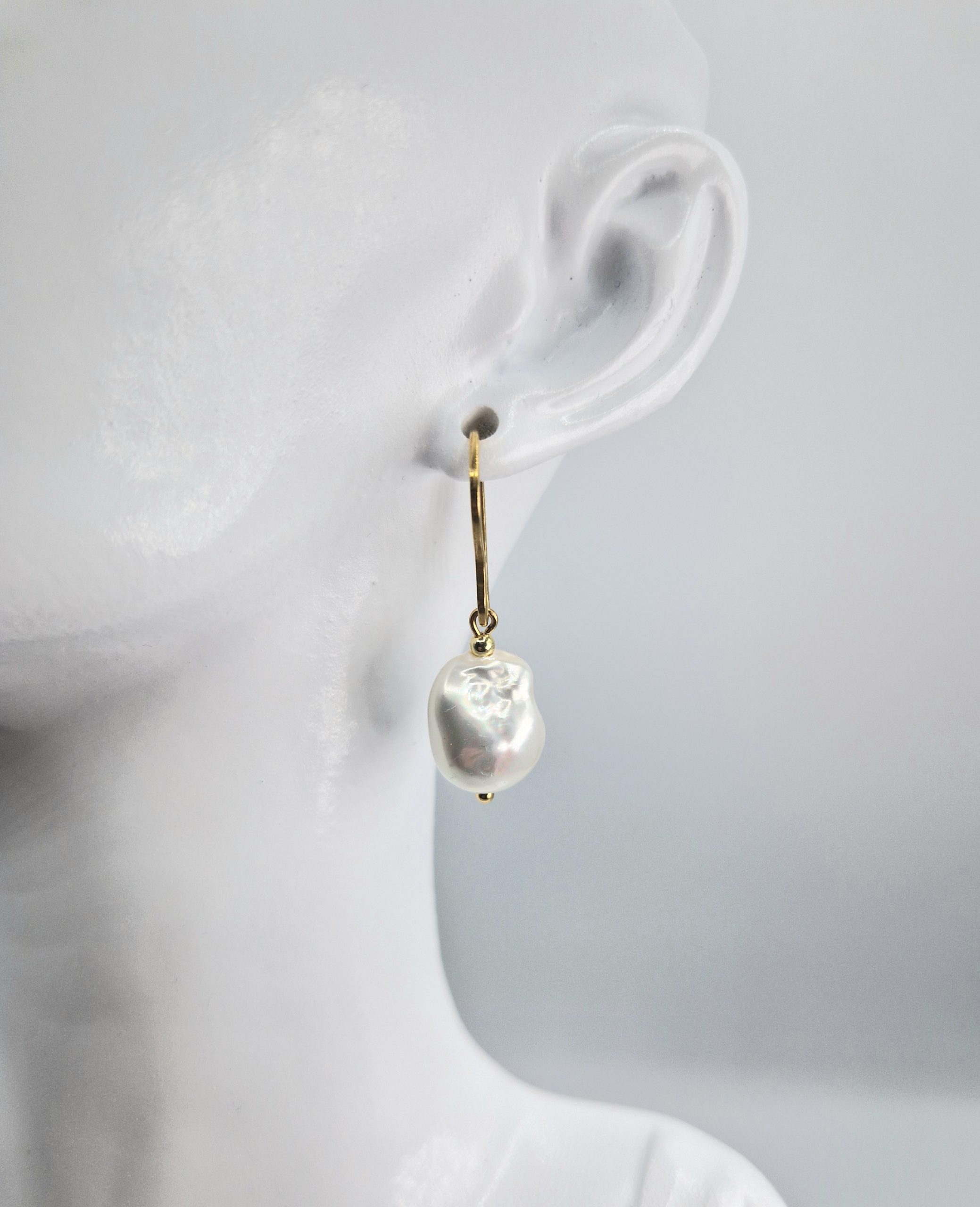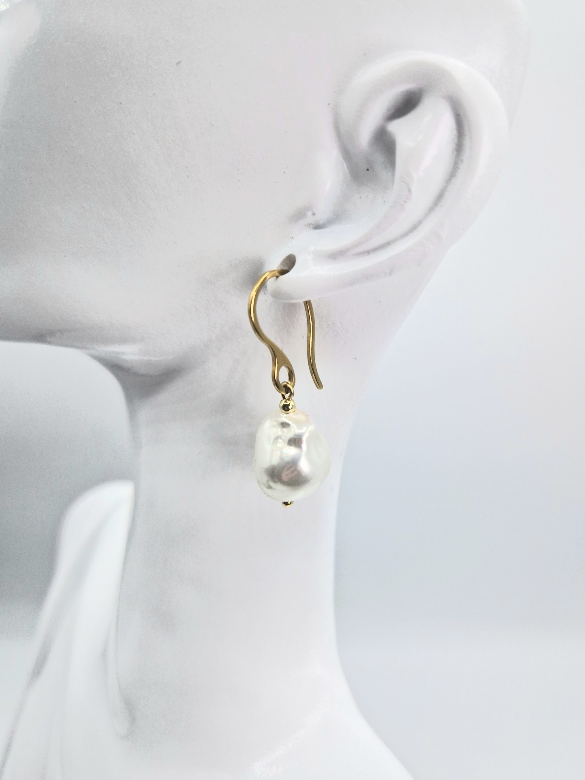 Pendientes hechos con primera calidad perla de Mallorca de 12 mm en forma barroca y acero inoxidable bañado en oro.