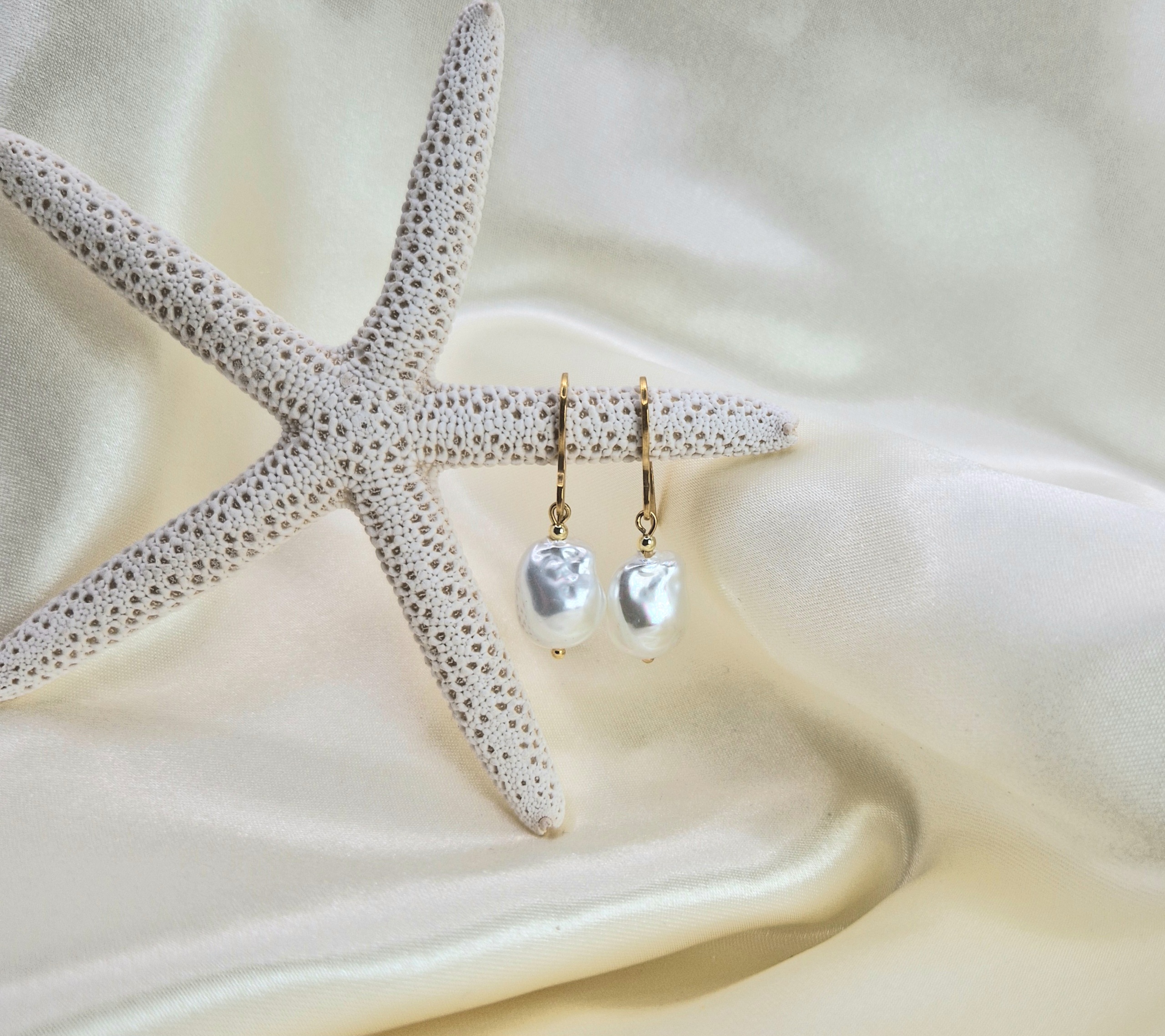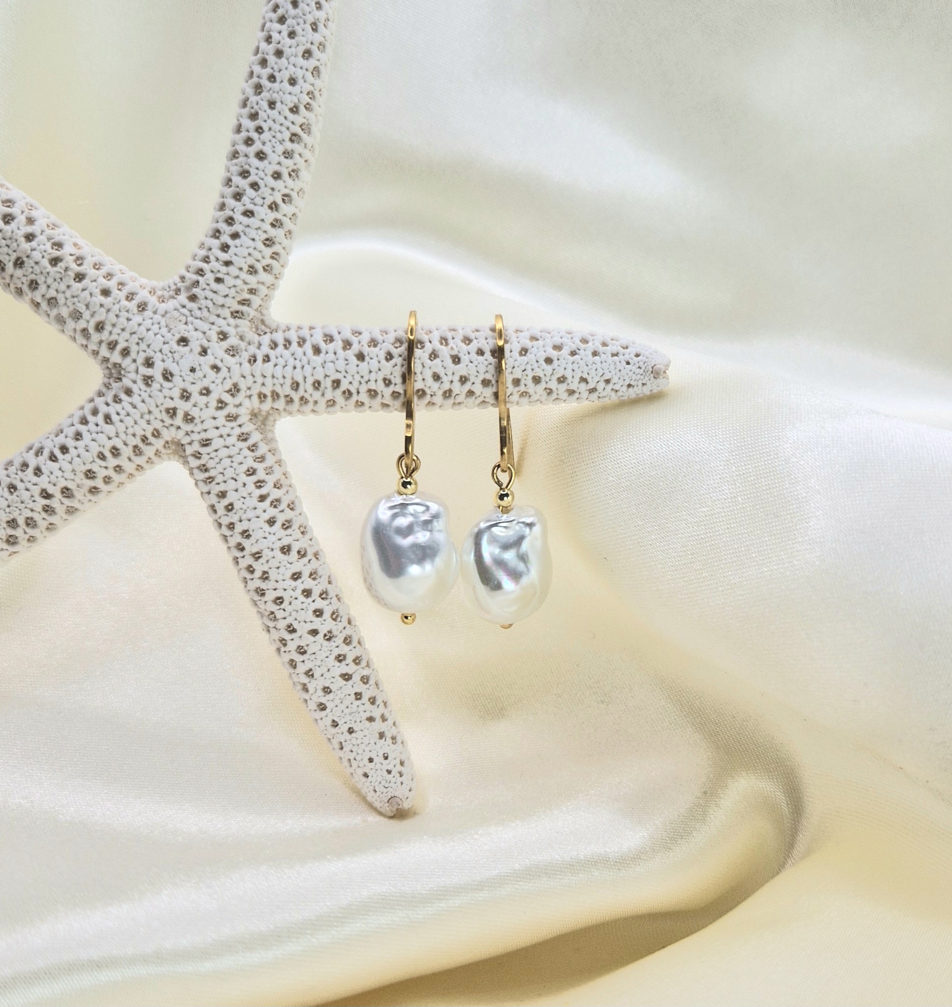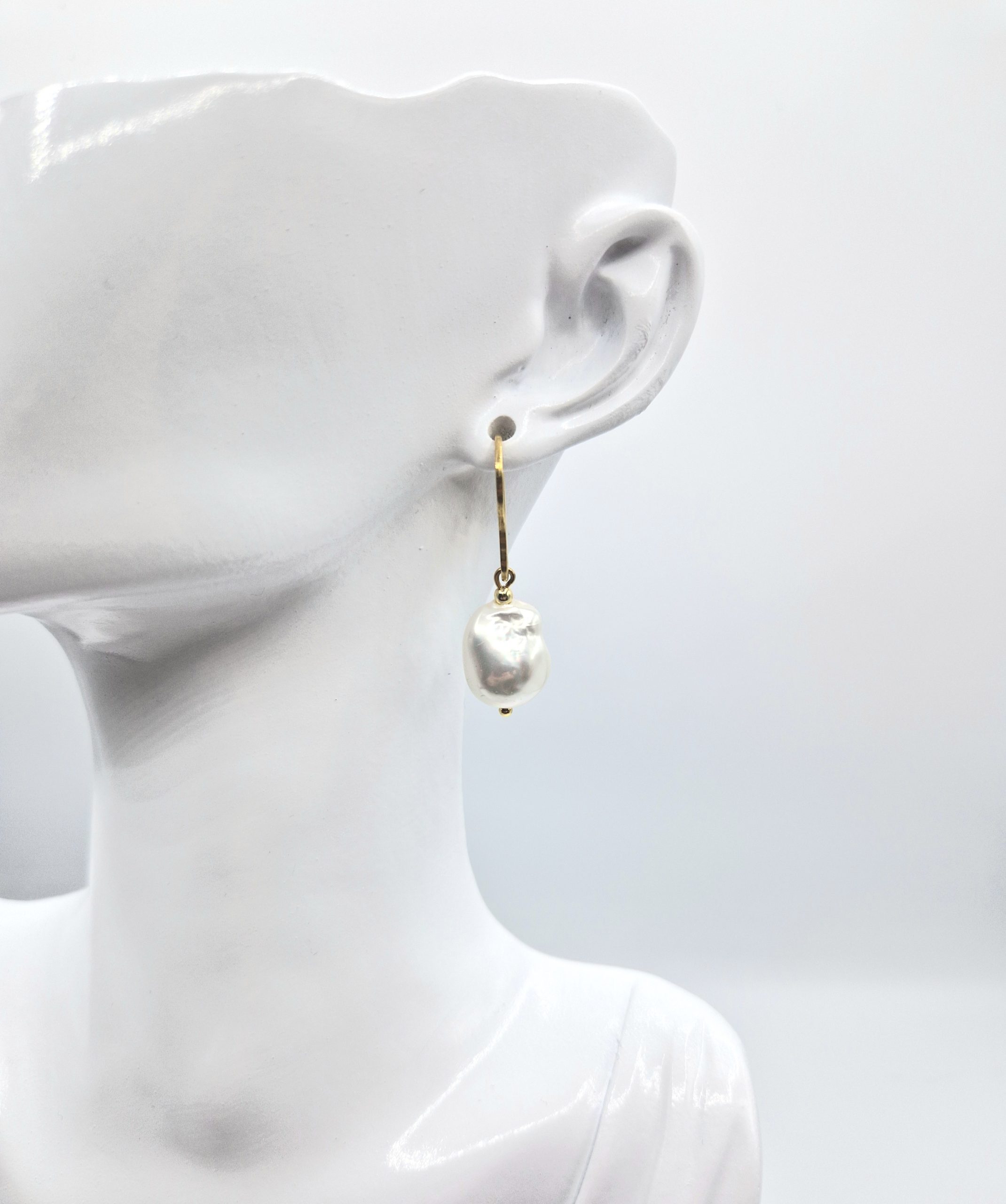 Pendientes hechos con primera calidad perla de Mallorca de 12 mm en forma barroca y acero inoxidable bañado en oro.