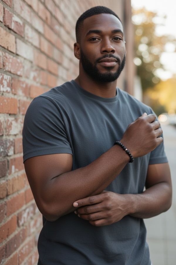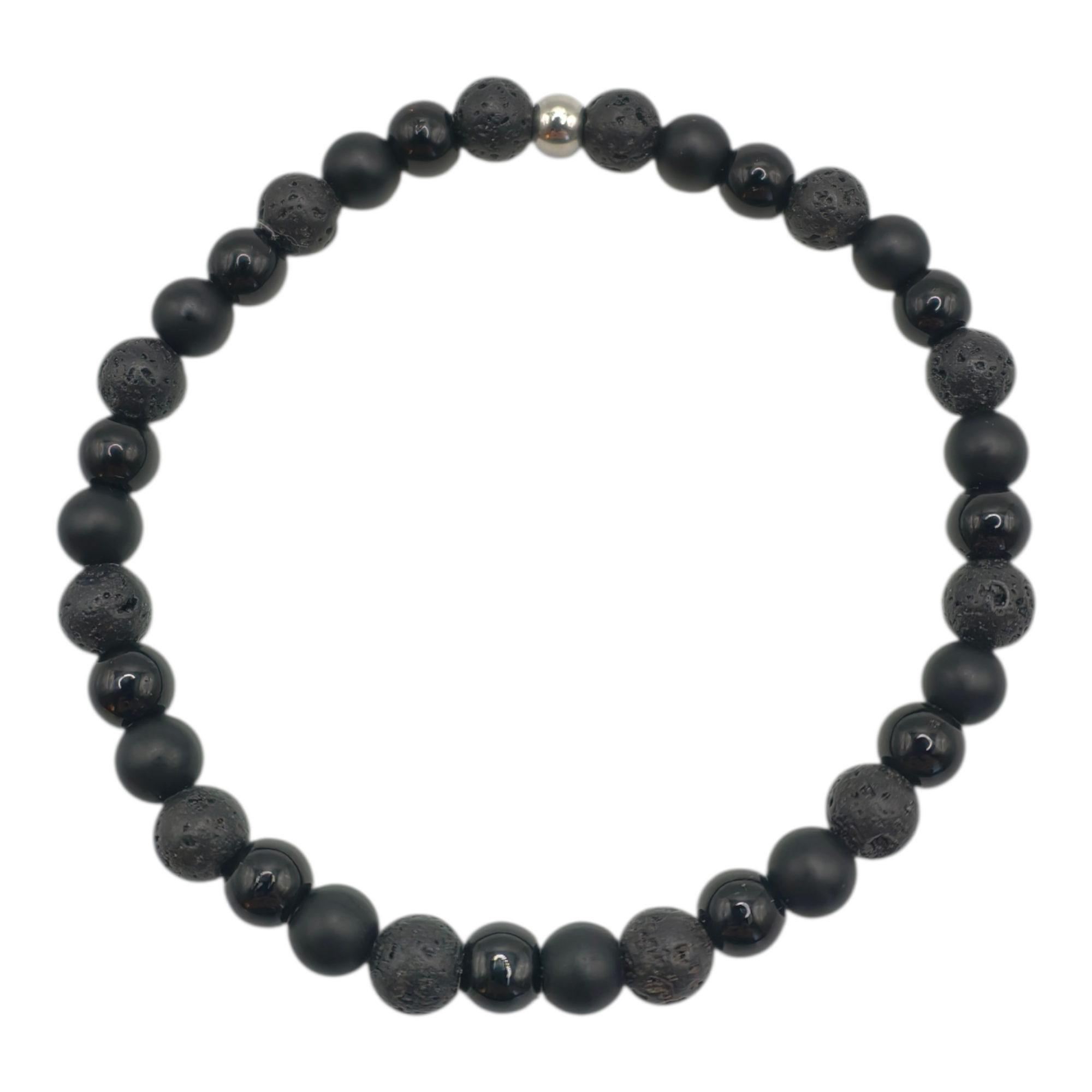 Pulsera elástica hecha con cuentas naturales de 6 mm, acabado con la bola de acero inoxidable.