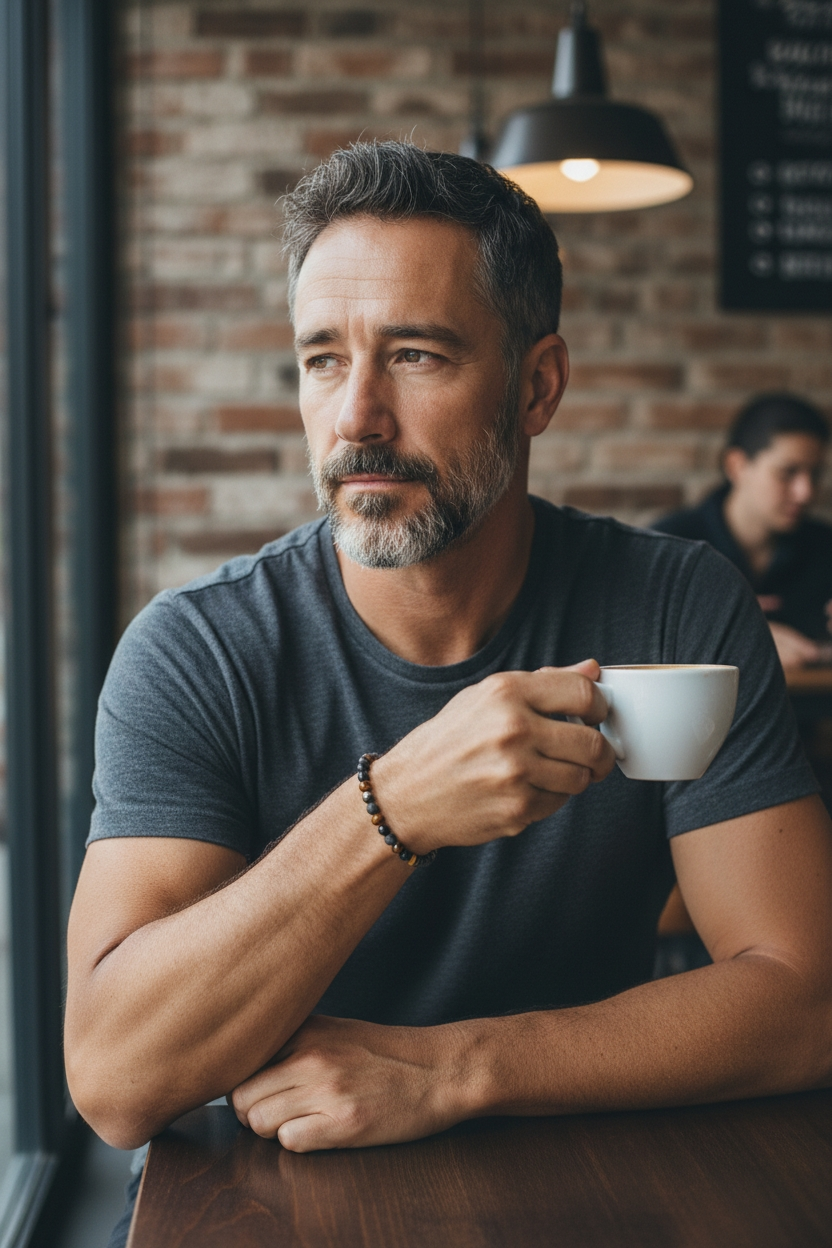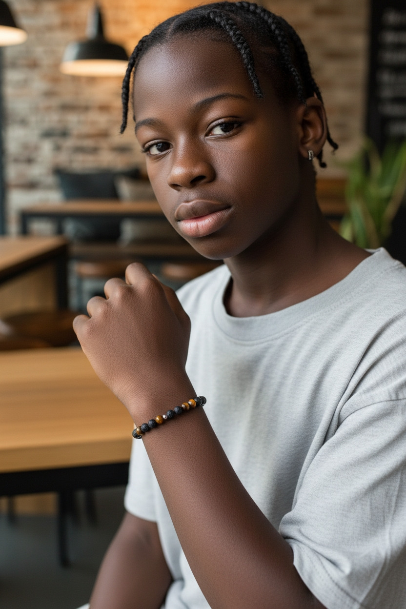 Pulsera elástica hecha con cuentas naturales de 6 mm, acabado con la bola de acero inoxidable.